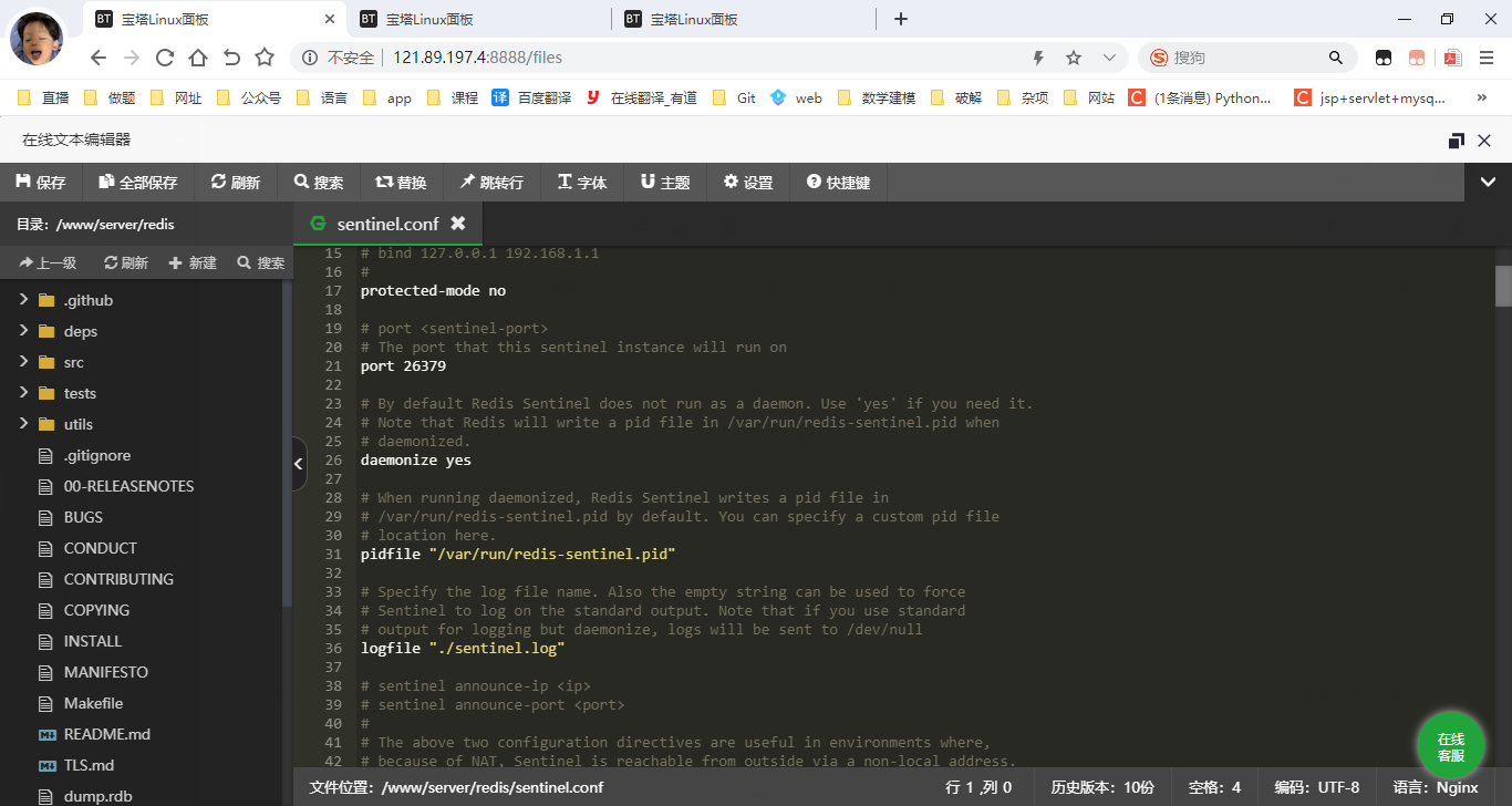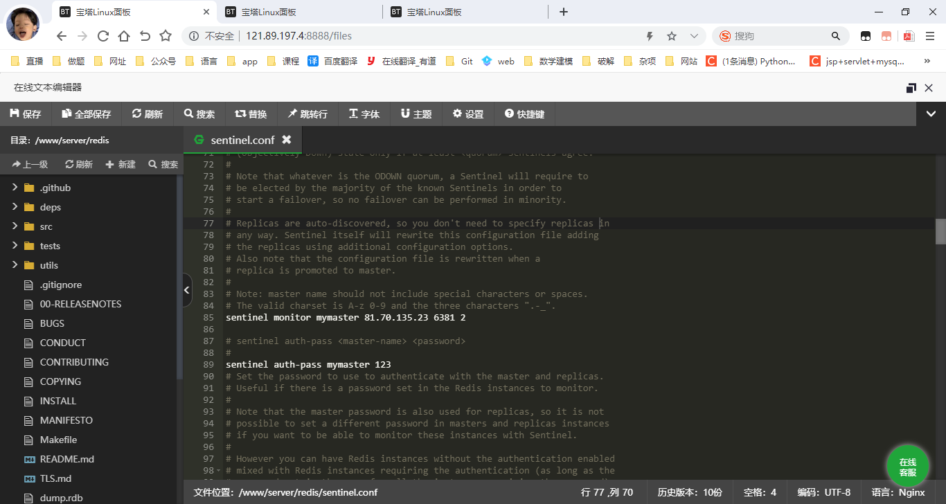 直接修改sentinel.conf(我是在服务器上面直接安的宝塔linux面板然后在软件商店安的redis,路径为/www/server/redis)