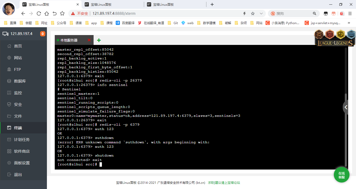 服务器有一点坏处就是不关机,加上我们前面配置的时候设置了后台运行,导致redis始终在后台挂着,再重复进行redis操作的时候就很容易因为忘了这事,而反复重启重加载配置导致redis的bug,所以这里演示完了我们把所有节点shutdown一下