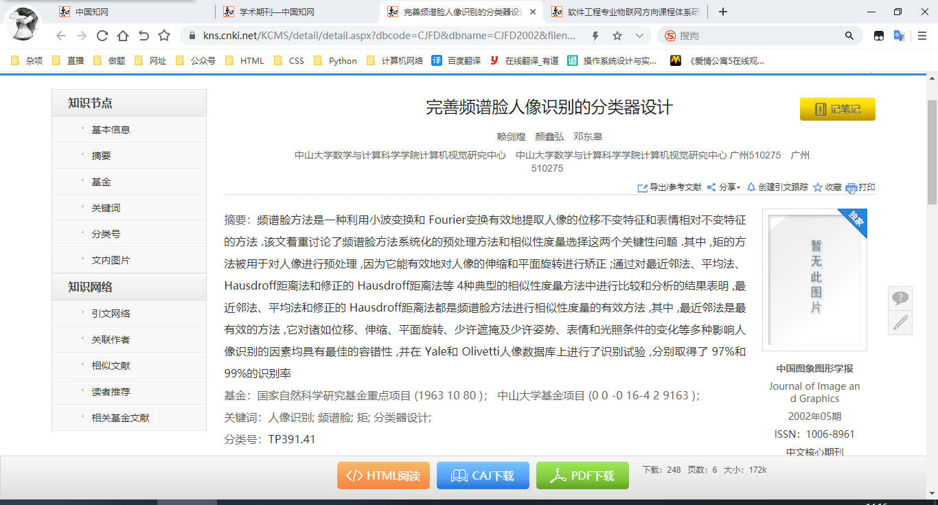 2、在中国知网CNKI“学术期刊”子库里检索:人脸识别(篇名)and中国图象图形学报(来源期刊)方面的期刊论文,共有 80 条结果,其中按“基金”排序,获得基金数量最多的是 国家自然科学基金 ,按“机构”浏览,发文最多的机构是 南京理工大学 。