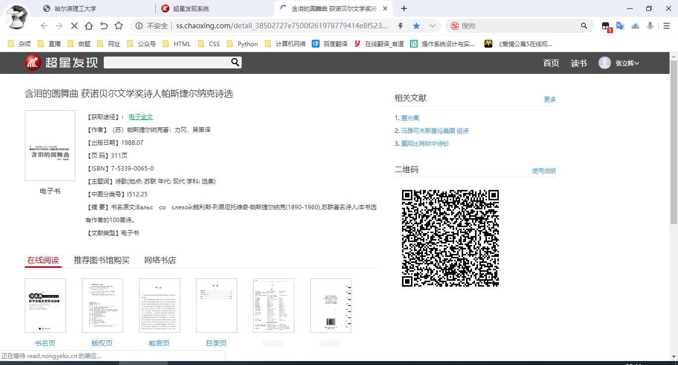 1、在超星发现的“图书”子库中检索“诺贝尔文学奖”相关的图书,共有 178 条结果,按“引文量”排序后,找出与你学号相同的那本书,打开详情页,并截图: