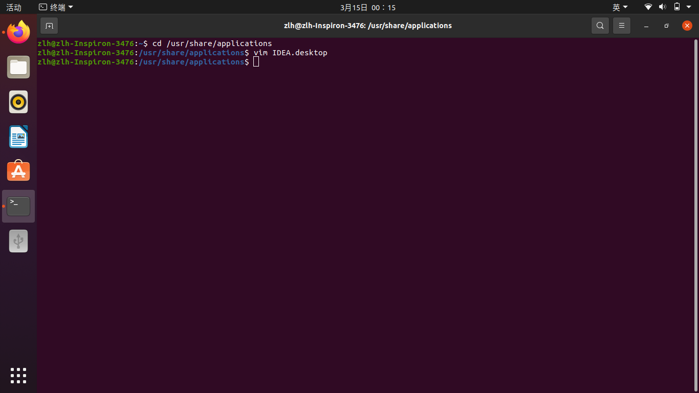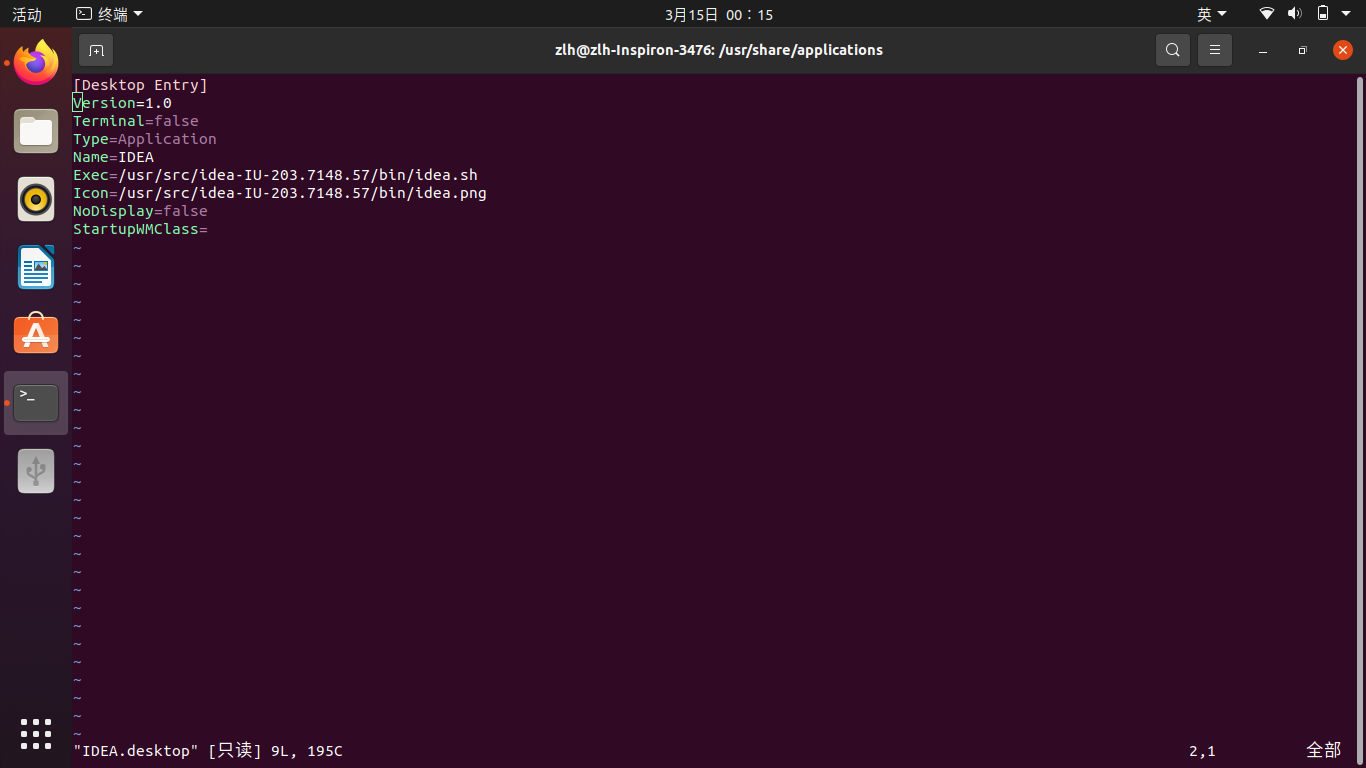 打开终端,输入cd /usr/share/applications,然后vim一个图标文件vim IDEA.desktop