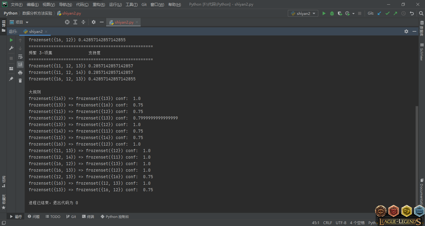 通过本次实验,我掌握关联规则分析的基本原理,掌握Apriori算法对于关联规则挖掘中频繁集的产生以及关联规则集合的产生过程,编程实现算法,调试运行,结合相关实验数据进行应用,得到分析结果。